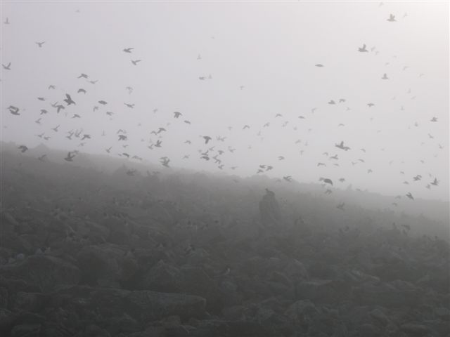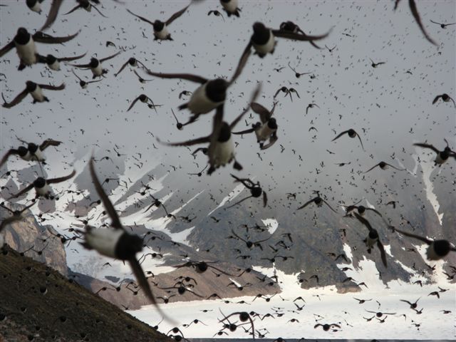 The Little Auk: The Little Auk, or Dovekie, is a small planktivorous seabird that breeds in huge numbers in the Atlantic sector of the High Artic, with the highest numbers concentrated in Greenland and Svalbard. Although these birds are notoriously hard to census, the East coast of Greenland population may exceed 10 million pairs, with the colony at Kap Höegh holding an estimated 100,000 pairs of birds. Little Auks are highly social and breed in large colonies on scree or talus slopes along the coast of Liverpool land, between Scoresby Sund and Carlsberg Fjord. Little Auks spend the winter at sea, and return to land in April to socialize and re-establish pair bonds and breeding sites before laying their single egg in mid June. The period of pre-breeding colony attendance fluctuates fairly erratically, with the colony often deserted for several days, but teeming with activity on other days. Birds are extremely social and vocal, with their somewhat hysterical “trilling” calls adding to the intense spectacle of movement and activity. Ann has worked at the colony of Kap Höegh since 2004. This study was part of a large collaborative project comparing the breeding and feeding ecology of populations of Little Auks foraging in highly contrasting oceanographic conditions in the Greenland Sea . We will be catching some birds at Kap Höegh during our visit to examine the condition of adults as they return to the colony after their winter at sea. Please email Ann if you have any questions about the Little Auk project (Ann_Harding@usgs.gov).